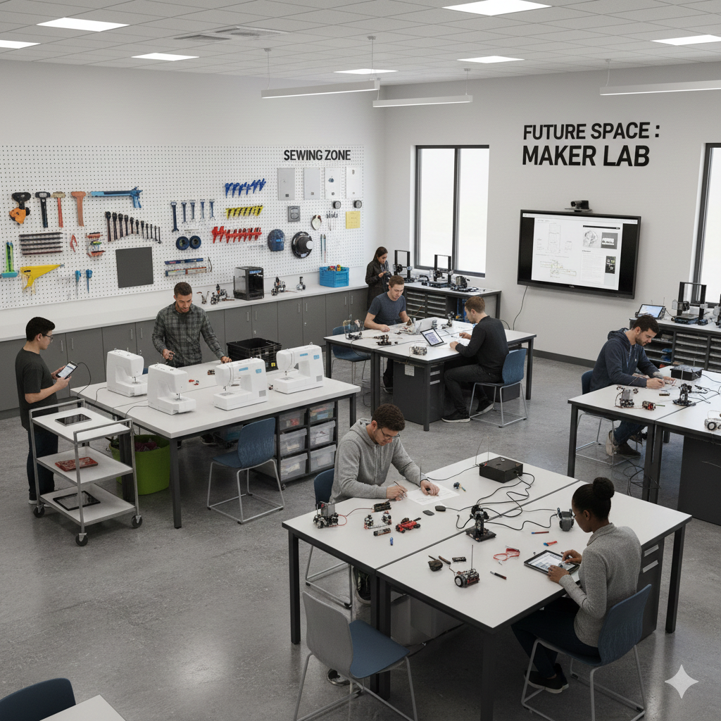 Includes modular work tables, pegboard tool walls, supply storage, a sewing machine area with cutting table, smartboard or interactive display, charging carts, and room for 3D printers and future tech.