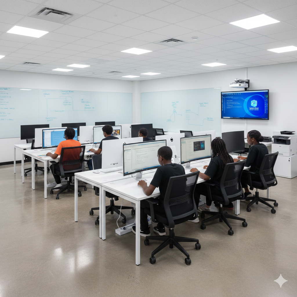 Featuring 12–20 ergonomic computer stations, polished concrete floors, a full whiteboard wall, mounted instructional screen, printer/scanner hub, and clean cable management.