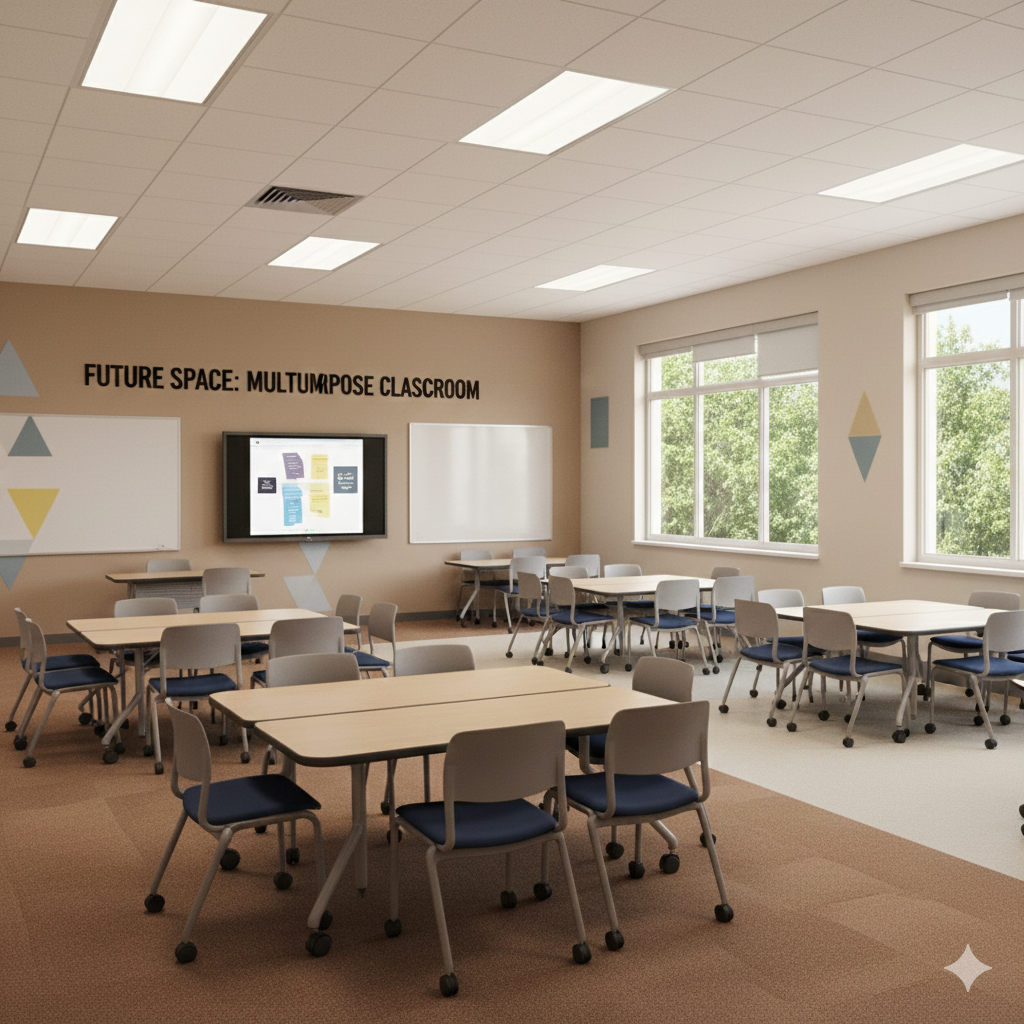 Each classroom includes mounted screens, stackable chairs, modular tables, and a warm, neutral color palette with mixed flooring.